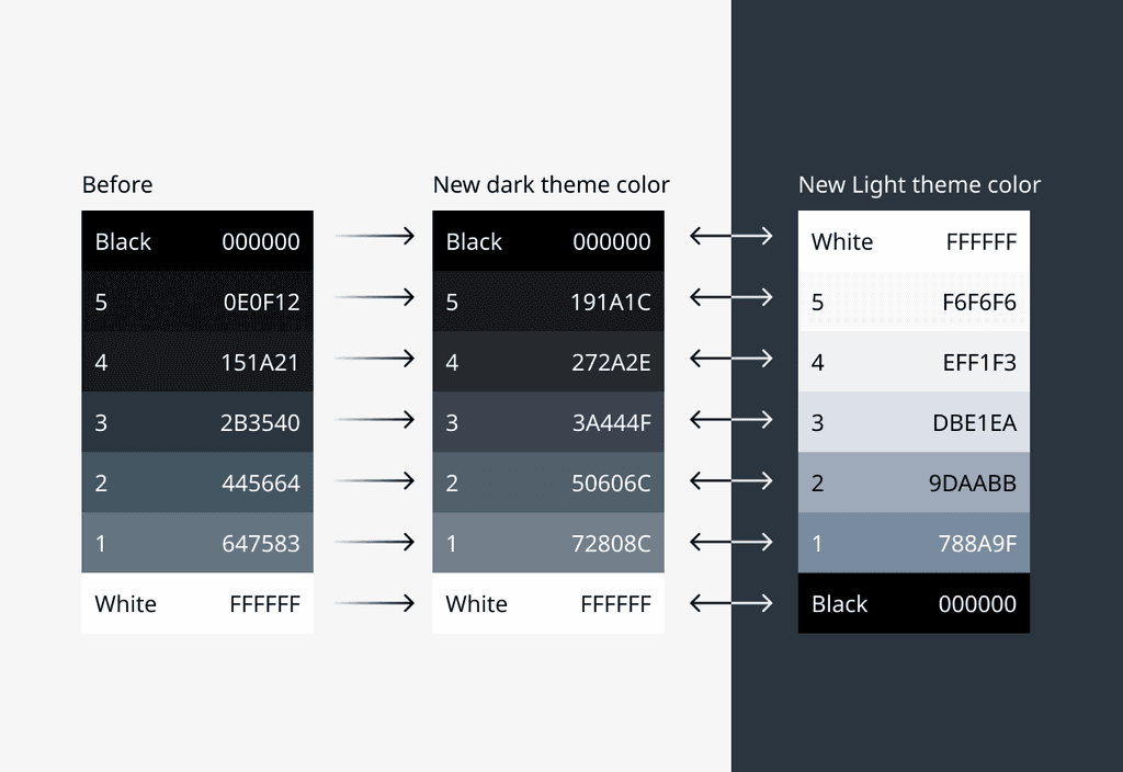 When implementing the dark/light mode functionality, we carefully selected a neutral grey palette (#8598A7) and highlight green (#00A48F) that works effectively in both themes.