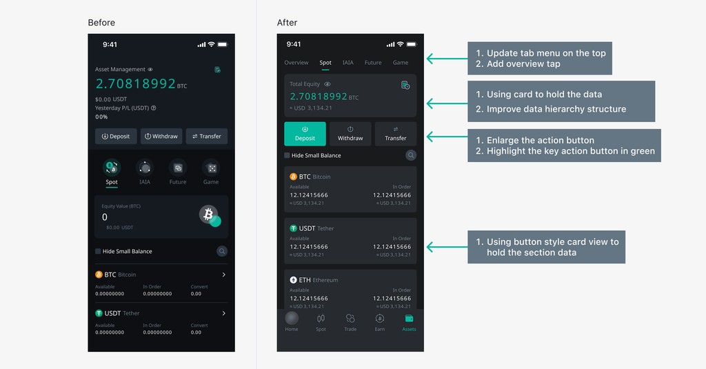 After organising the visual elements and standardising the design guidelines, we revamped the Asset and Earn functions. The revamp significantly enhances the user experience by improving navigation, visual hierarchy, and overall aesthetics.